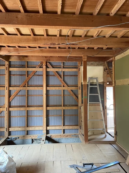 さあどうしようかということになり、2転、3転して日本間を思い切ってワンルームのLDKにすることになりました。屋根は葺き替えずに耐震設計をしたところ、上部構造評点を1.0に持っていくのがやっとだったので、命を守る耐震改修工事でご納得いただき、今回の工事がスタートしました。